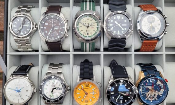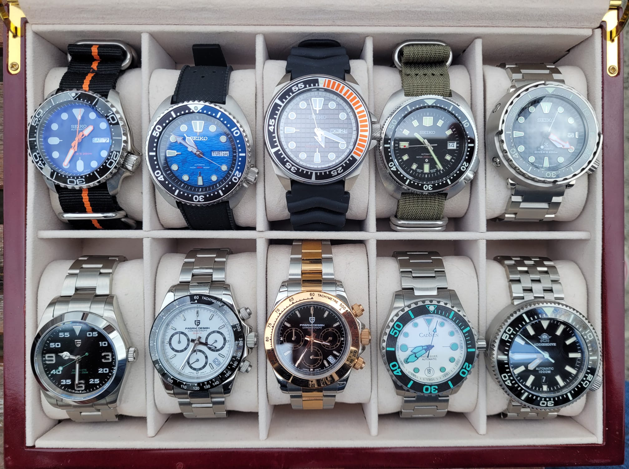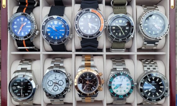 The “AliExpress brands and builds” box. Weekend fun watches. A few homages here (the bottom row), of Rolex, Halios, and Helm, which not only are unattainable for me, but I wouldn’t want the hassle of owning such an expensive piece of jewelry. The SKX, Samurai, Turtle “Manta Ray”, Capt Willard, and Tuna (the whole top row) are builds and mods, all with Seiko NH36 or NH36 movements, aftermarket bezel inserts, dials and hands, all variations on the originals: for example, the Samurai case and hands has a “King Turtle” dial and day/date movement; the SKX has semi-skeletonized bright orange hands, double-domed sapphire crystal, and an Omega-style bezel insert. This is my most favorite group, each watch is really fun, straps and bracelets change easily, they look and feel great to wear, the 1000m diver is ridiculous, and each cost <€100. Building (assembling) a watch yourself is great fun, you have freedom to do whatever you like by choosing the movement, hands, dial, crystal, and case style; and if your watch ever breaks, you know how to fix it.