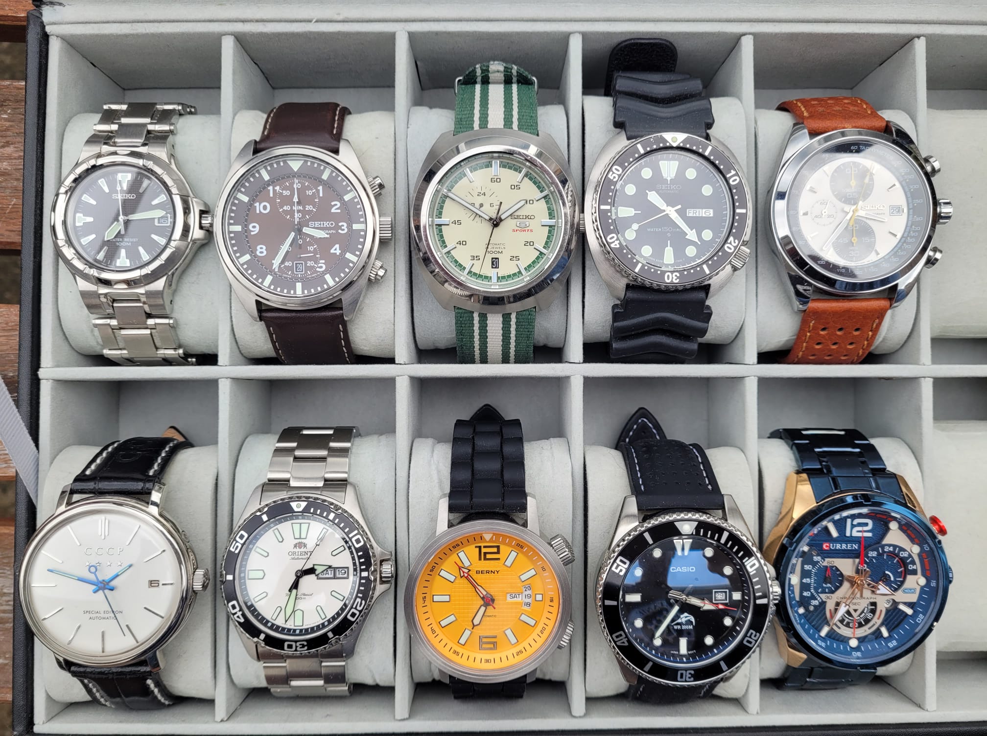 The “nicer ones” box. Here we have actual Seiko models, a weird art-deco Soviet-themed dress watch, an interesting bright Chinese compressor-style diver, the domed-sapphire-crystal-mod Casio Duro, and a few gifts. The vintage Seiko 6309-7040 diver is the one that started me down this rabbit hole. I don’t wear these as often, though I probably should. I really like that Seiko 5 Sports “Diastar” SSA285 (center top), it is now discontinued, they were never terribly popular, but I think it’s aged well.