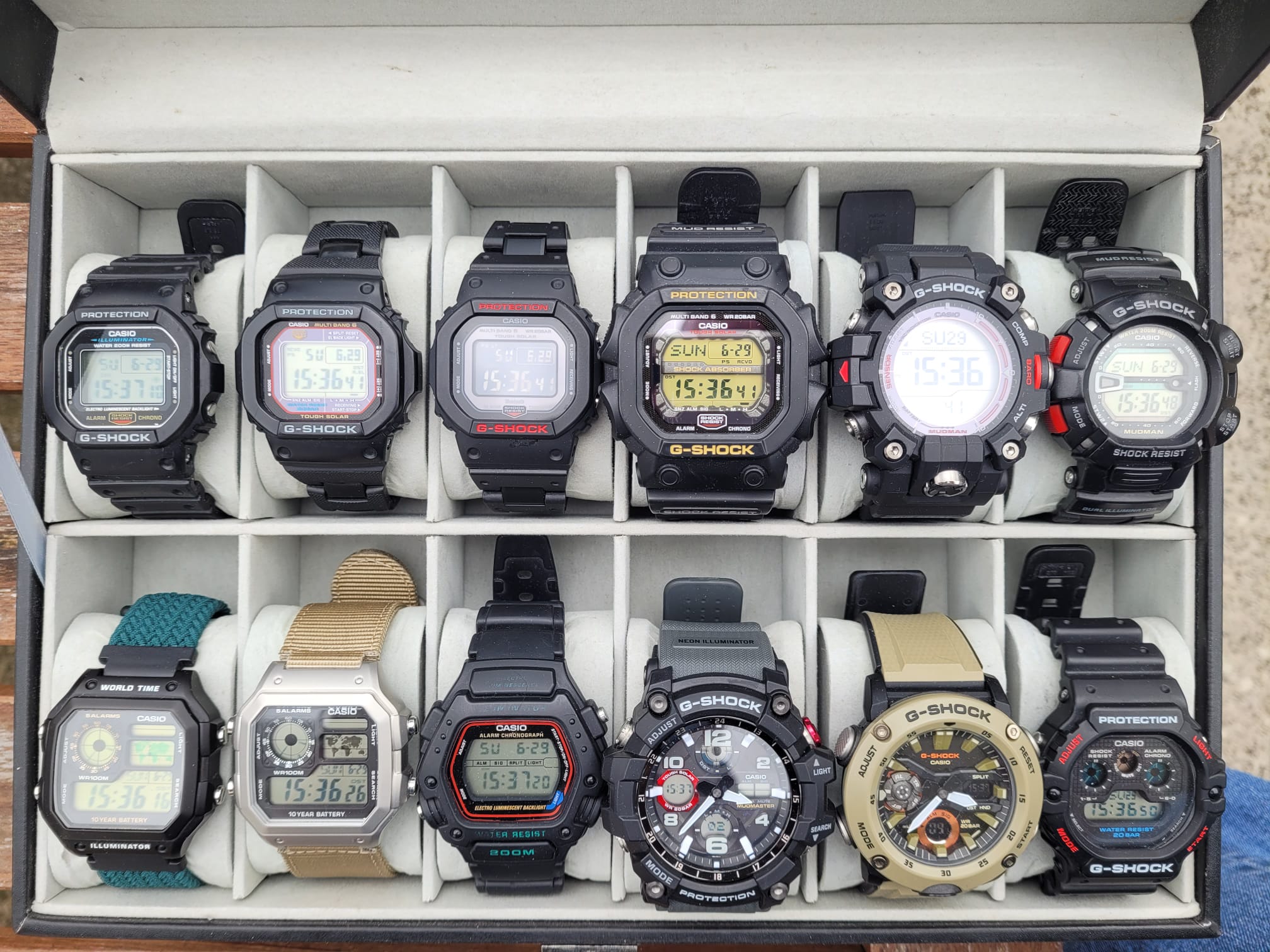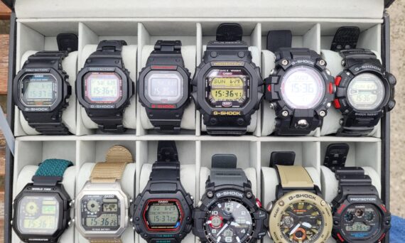 Here’s the Casio box, mostly G-SHOCKs. A few have moved in and out lately, as G-SHOCKs are the most resellable watches in my collection. Sizes range from normal, to big, to really big. These are my “go-to” watches, as there’s very little that can hurt them, and there’s so much variation there’s always something to match with whatever activity I’m doing, the mood I’m in, or even what t-shirt I’m wearing that day. The GW-9400 Rangeman was sold and replaced with a GW-9500 Mudman, which then led me to finding that old-school G-9000 Mudman a retailer just wanted rid of. The GSG-100 Mudmaster was a surprise recent addition, I was looking for a big case analog G-SHOCK, when two of them popped up at great prices – I got both, flipped one for some profit, and kept the other. I’ve decided to put the “wavy marble” GA-2000 for sale, and only keep the one GA-2000 in brown & orange, a watch I do wear often. The “Casio Royale” models now both have stainless steel cases, and upgraded straps, which improves their external shortcomings to match the brilliance of the watch movement.